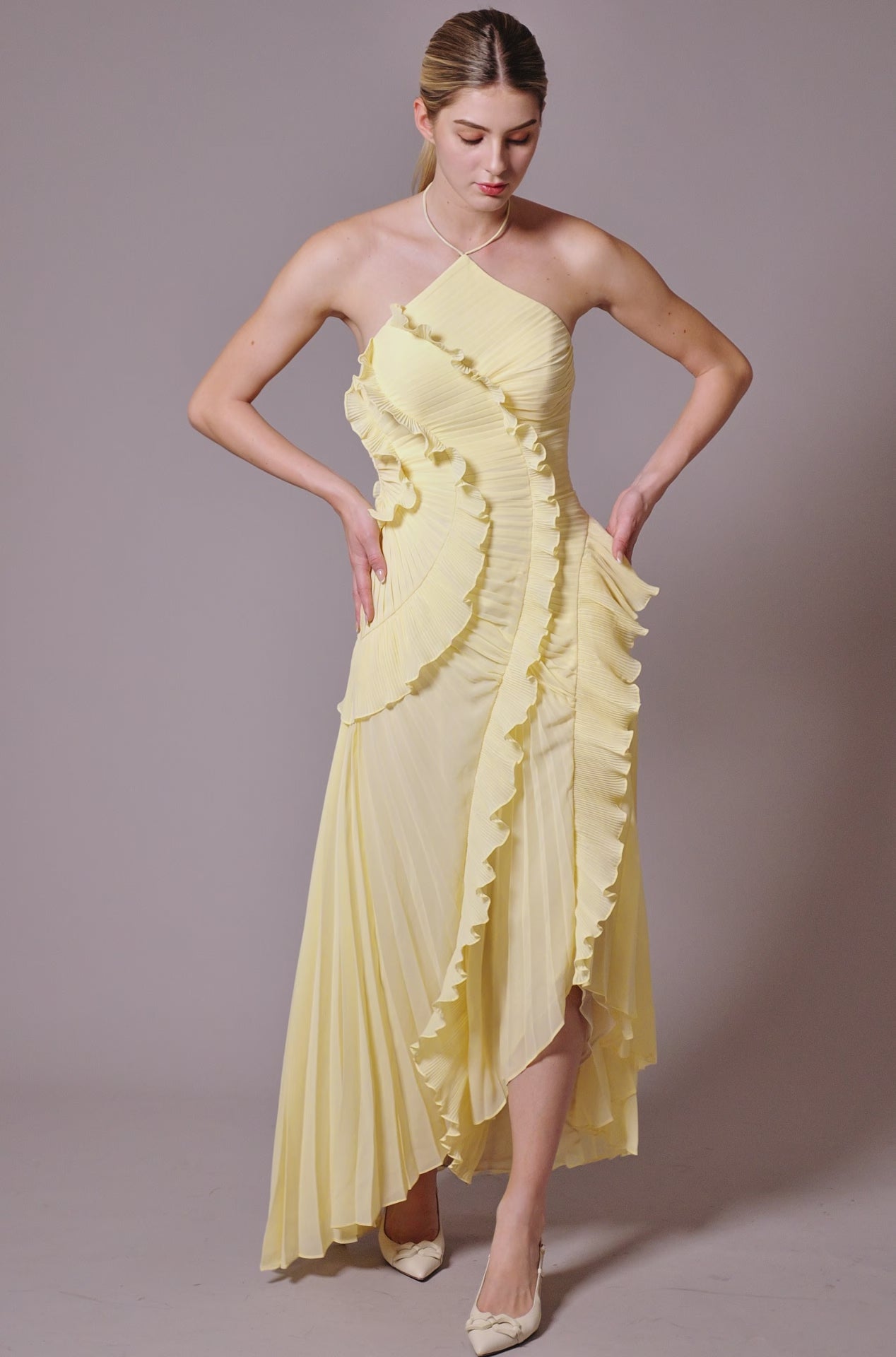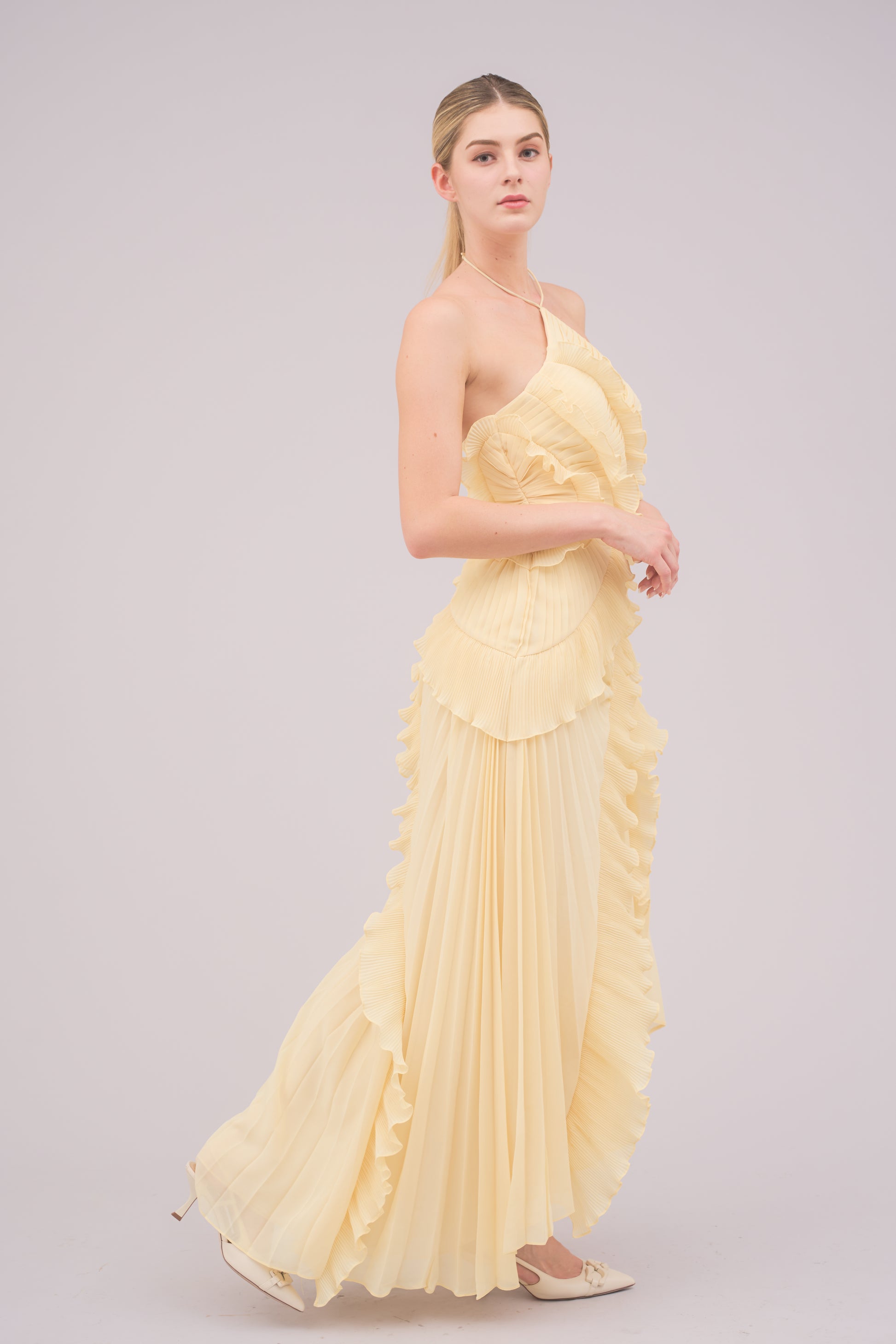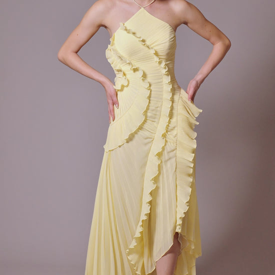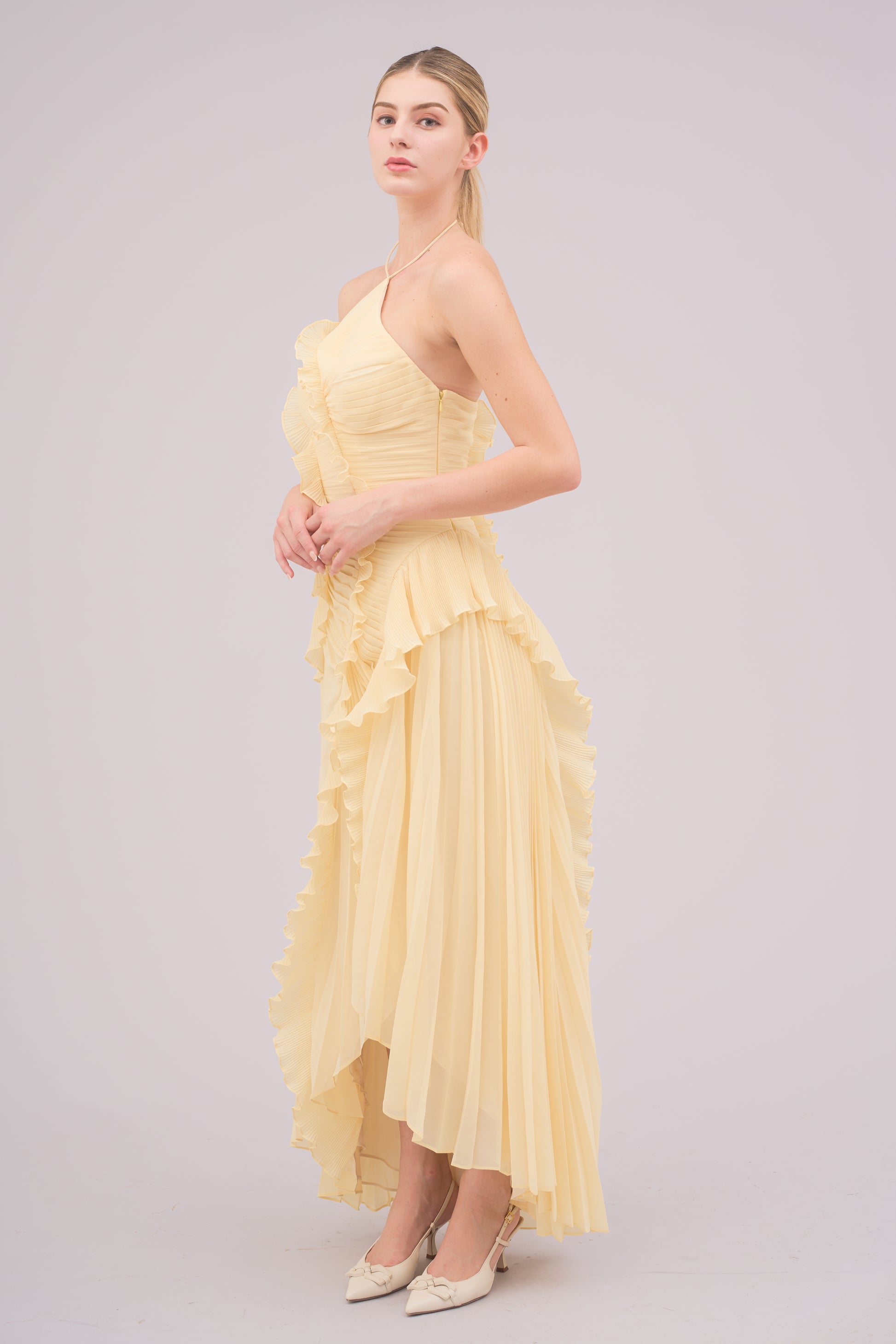 Crafted in sunlit chiffon and sculpted pleats, ‘Aurora’ radiates soft luminosity, combining fluid ruffles with refined structure for a silhouette that captures light with every movement.